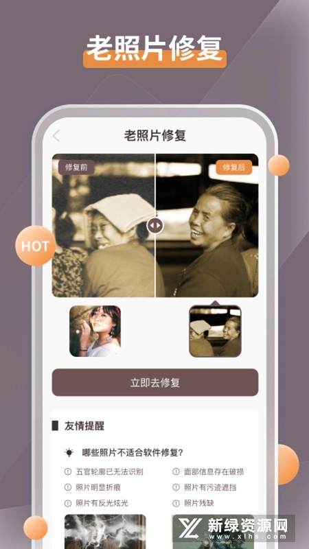 智能修复老照片安卓版是上海灵豹信息科技有限公司开发的一款实用工具,它能智能修复老旧照片,通过AI技术提升画面质感,让旧照片恢复崭新样貌。此外,还具备照片降噪、去雾以及过曝修复功能,可使照片更加精细精美,欢迎大家前来体验!
