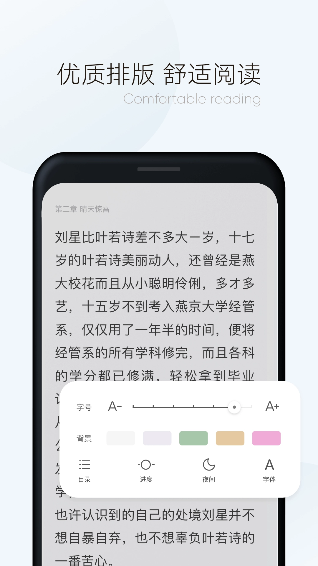 4. 阅读设置:支持多种字体、背景、翻页动画等自定义功能,助力用户打造专属的个性化阅读界面。