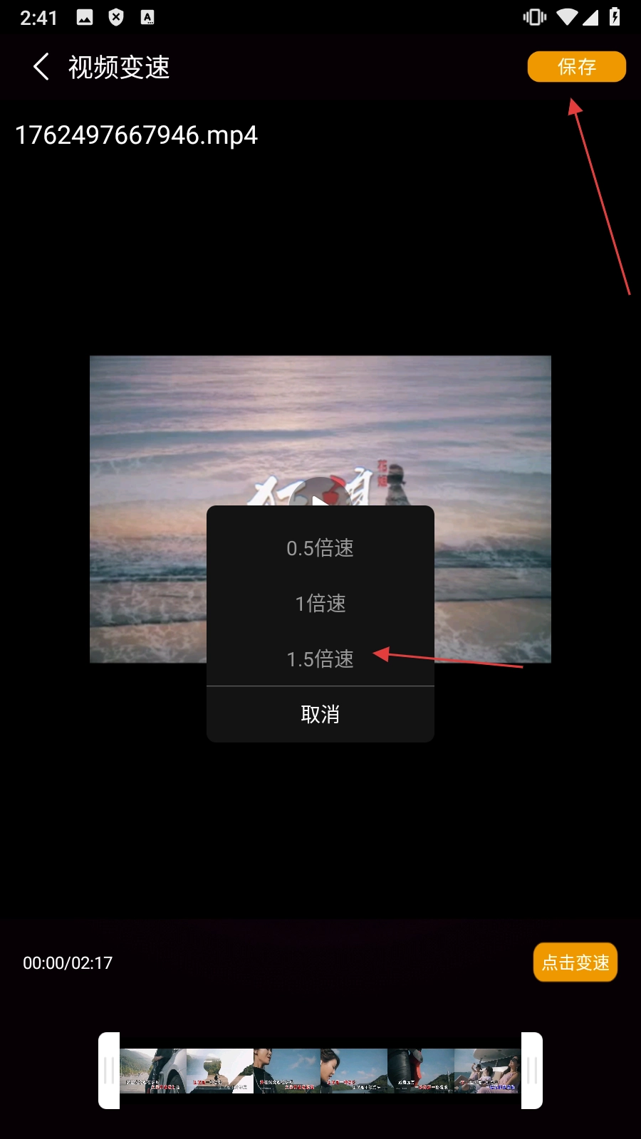 4、选好【倍数】后,点击【保存】按钮,就能完成视频变速的操作了。