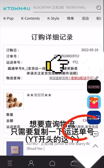 5、找到要查询订单的物流单号(yt开头的)。