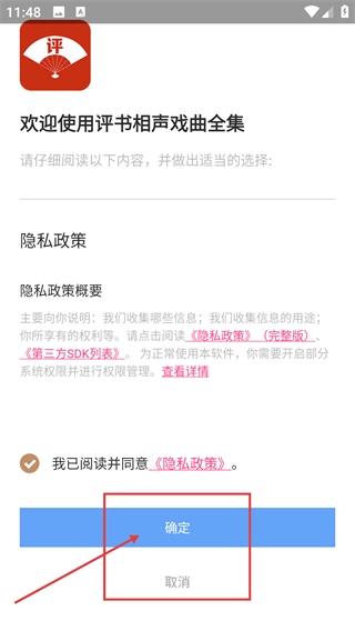 1、勾选【我已阅读并同意《隐私政策》】后,点击【确定】按钮,就能进入【评书相声戏曲全集】应用使用相关功能。