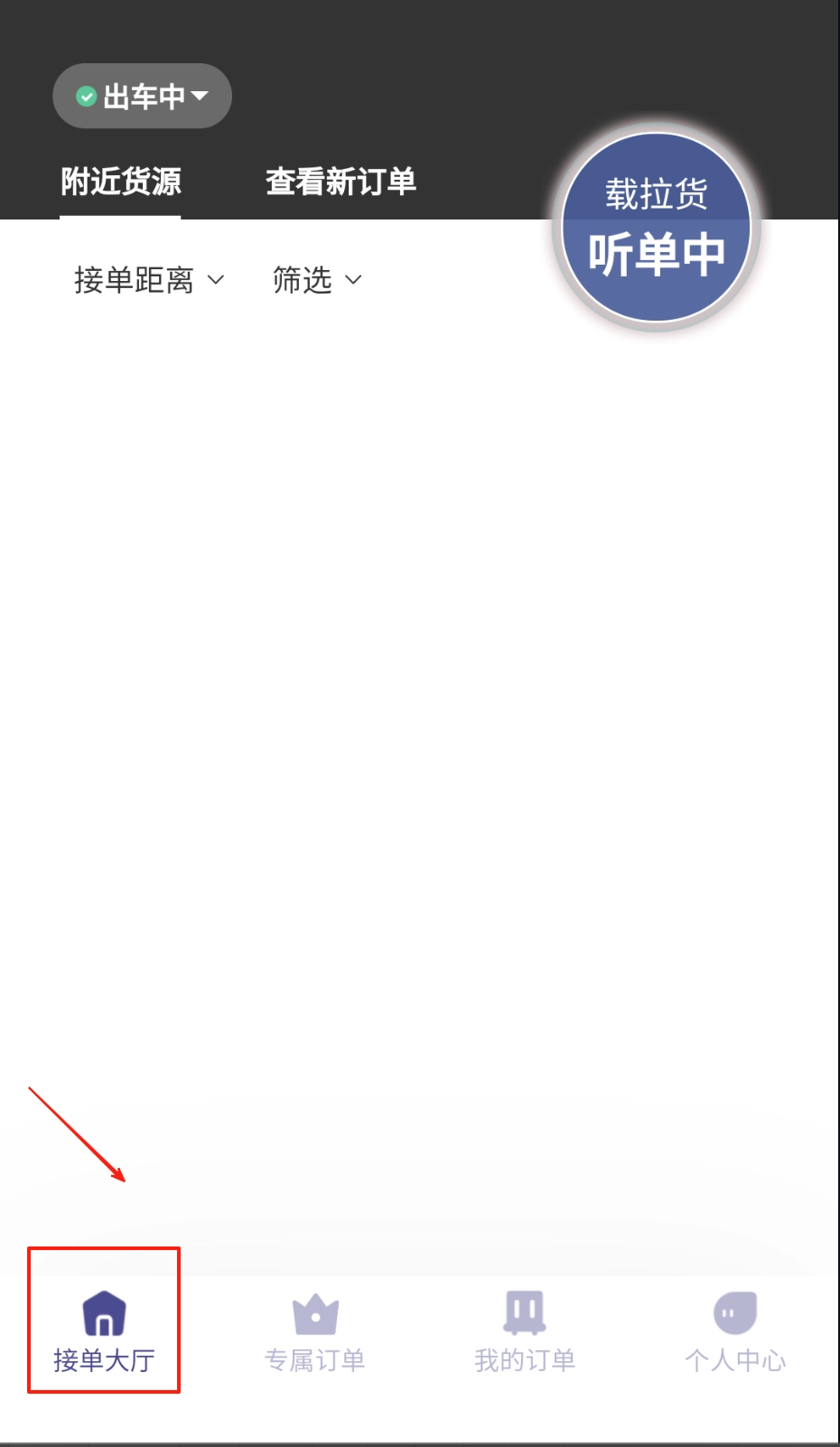 1、打开应用进入接单大厅页面后,系统会自动定位周边的货源信息,你可以借助筛选条件来快速找到符合运输需求的订单。