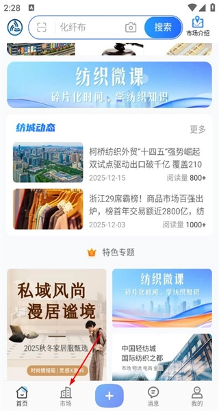1、进入软件首页后,能够浏览纺织微课之类的内容,点击底部的市场选项,即可进入实体市场页面。