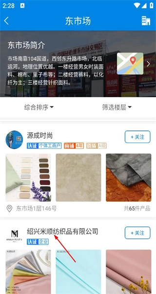 3、进入东市场页面后,找到绍兴米顺纺织品有限公司并点击进入其店铺界面,随后浏览查看店铺内的商品。