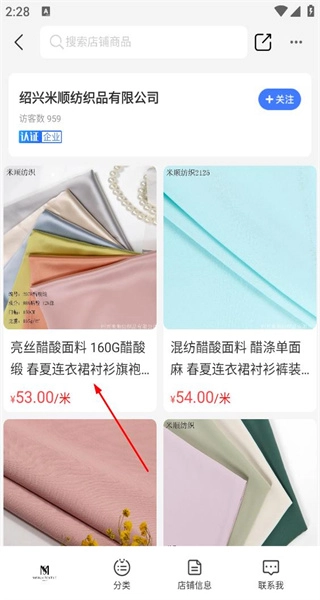 4、进入商家的店铺页面后,浏览页面上展示的各类纺织商品,重点查看亮丝醋酸面料这类商品的具体价格和详细信息。