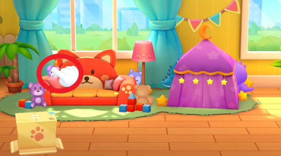 1、留意沙发的左边区域,能看到有个戴着紫色帽子的人藏在沙发后面,点击查看一下这个人是不是奇奇。