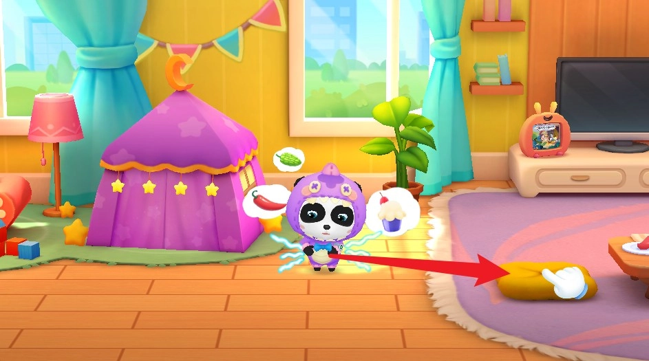 2、把宝宝拖到坐垫上,宝宝会自己坐好,等着接下来的生活体验或者任务提示。