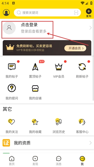 1、在【我】的页面点击【点击登录】区域,登录后可使用【我的帖子】-【置顶帖子】等更多功能,解锁完整服务。