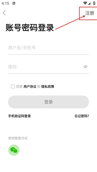 3、在【账号密码登录】页面点击右上角的【注册】按钮,即可进入新账号的注册流程,此外也可以选择【手机验证码登录】等其他登录方式。