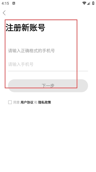 4、进入【注册新账号】页面,填写【符合正确格式要求的手机号】,勾选相关协议后点击【下一步】按钮以推进注册流程。