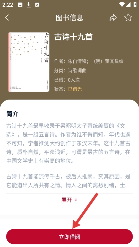 3、在图书信息页可以查看《古诗十九首》的作者、分类等信息,要是想借阅这本书,点击【立即借阅】按钮就可以了。