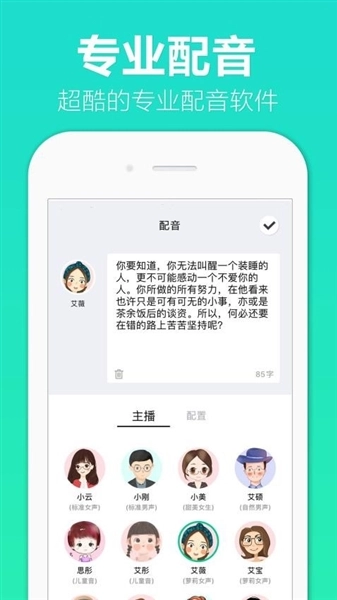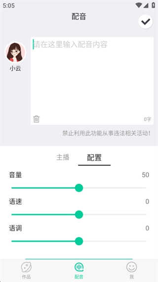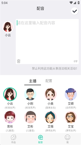 2、输入需要配音的内容,挑选合适的主播音效,点击右上角的“√”按钮,就能完成配音的生成。