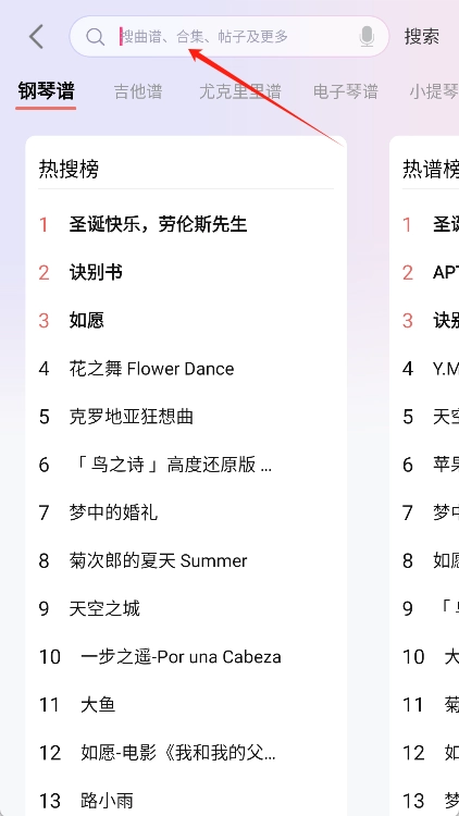2、在主界面借助搜索功能查找所需乐谱时,可依据曲名、歌手或者乐器类型来进行搜索。