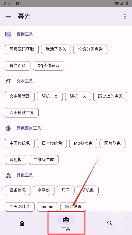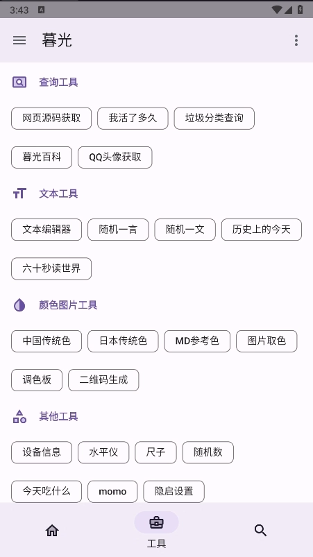 1、手机工具箱:暮光整合了查询工具、文本工具、颜色图片工具等各类实用工具,能为用户的日常操作提供便利。