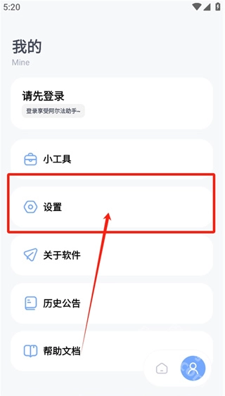 首先前往魔趣网并下载安装阿尔法助手的最新版本,进入应用首页后,点击页面右下角的“我的”选项。