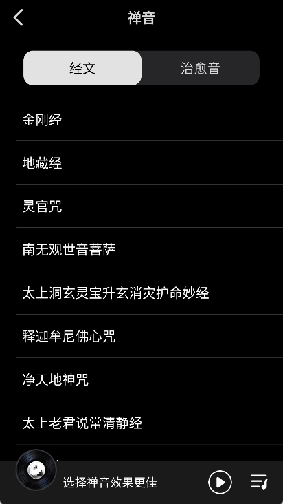 5. 音乐可自由选择:支持免费更换背景音乐,共有16种音乐可供挑选,其中还包含佛经诵读内容,能帮助您静心修行。