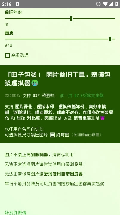 水印用户名支持自定义,可选择按原尺寸输出图片;若遇到无法正常选择或保存图片的情况,建议尝试使用手机自带浏览器;年份选择不足时,可在页面内拖动搜索;输出的图像还能再次进行包浆处理。