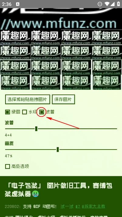 电子包浆生成器具备多种功能,包括图片绿化、虚拟水印添加、虚拟传播年份设置、高效率模糊处理、浮雕与锐化效果、噪点颗粒添加、像素不对齐调整、多次包浆绿化模拟,还支持基础对比度调节、亮度调整以及波普重复功能。