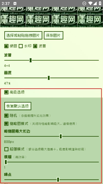 还设有高级选项,若需对水印文字、虚拟水印、颗粒、卷积等细节参数进行自定义设置,均可在高级选项中调整,具体如图所示。
