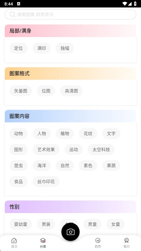 提供以图片为基础的图片搜索服务。用户仅需拍摄花型照片并上传,系统就能借助大数据算法,从海量素材库中一次性匹配出所有相似的花型,让图像识别与搜索难题得以轻松化解。