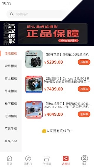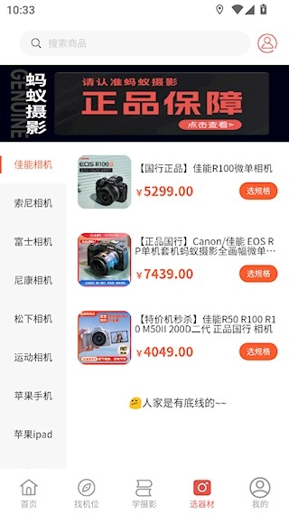 2、选器材界面有索尼、尼康等大牌正品相机购买