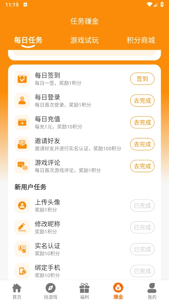 5、福利页面,用户可通过完成任务获取对应的礼包。
