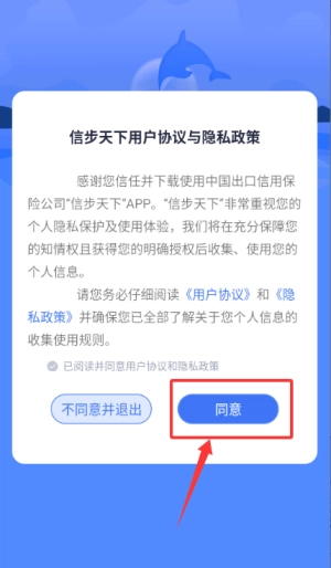 1、在信步天下里勾选同意选项并点击“同意”按钮,即可进入主界面。