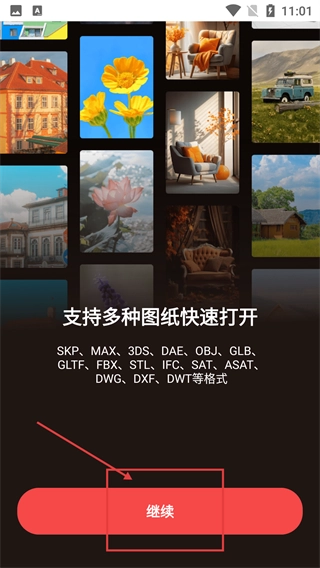 1、在展示【支持多种图纸快速打开】的引导页面时,点击底部的【继续】按钮,就能进入应用的主界面。
