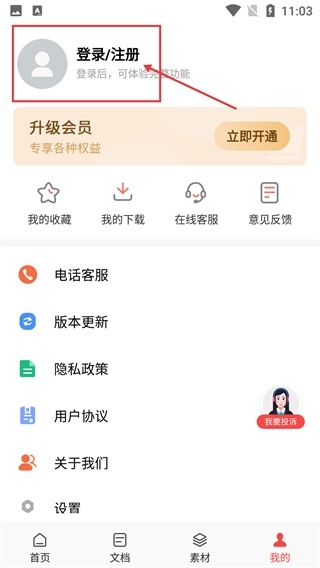 3、进入【我的】页面后,点击顶部显示“登录后-可体验完整功能”提示的【登录/注册】区域,即可进入对应的登录界面。