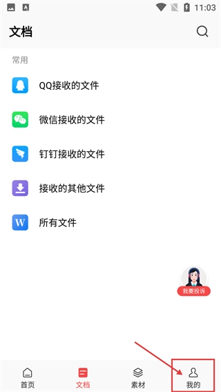 2、在【文档】页面,能够查看【QQ接收的文件-微信接收的文件】等分类,点击底部导航栏的【我的】选项,即可进入个人中心页面。