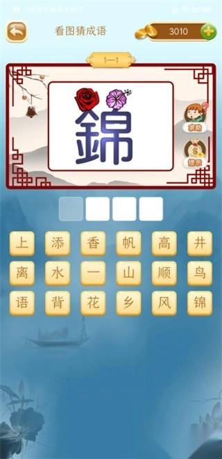 玩家能够依据所给的部分成语及提示补全完整的成语,也可以按照上一个成语的最后一个字来衔接下一个成语的第一个字。