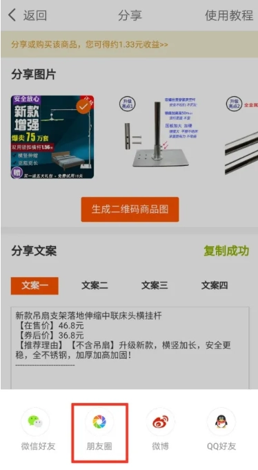 点击页面上的“生成二维码图片”按钮后,系统会自动生成一个包含商品信息的二维码。接着点击“分享”按钮,你就能选择将其分享至朋友圈、微信好友等不同平台。