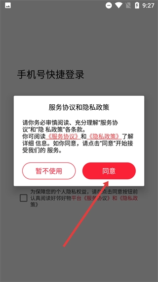 当弹出【服务协议和隐私政策】的窗口时,请先仔细阅读其中的相关条款,之后点击【同意】按钮,这样就能进入到接下来的登录步骤了。
