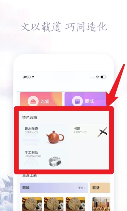 1、特色云南栏目包含陶瓷、书画和手工制品分类,展示本地文化魅力,便于用户快速选购和了解。