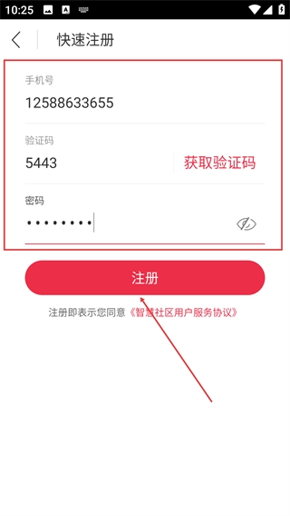 4、在快速注册页面填写手机号、获取并输入验证码、设置密码后,点击【注册】完成账号创建。