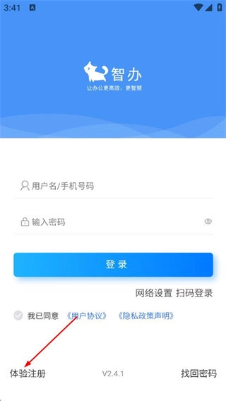 2、在智办登录页面,点击体验注册选项,进入注册界面。