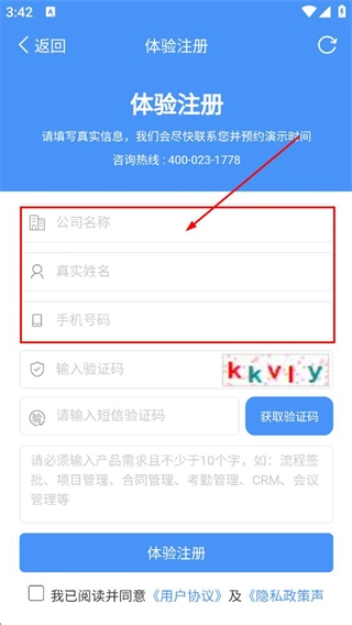 3、在体验注册页面,依次填写公司名称、真实姓名、手机号码对应的内容。