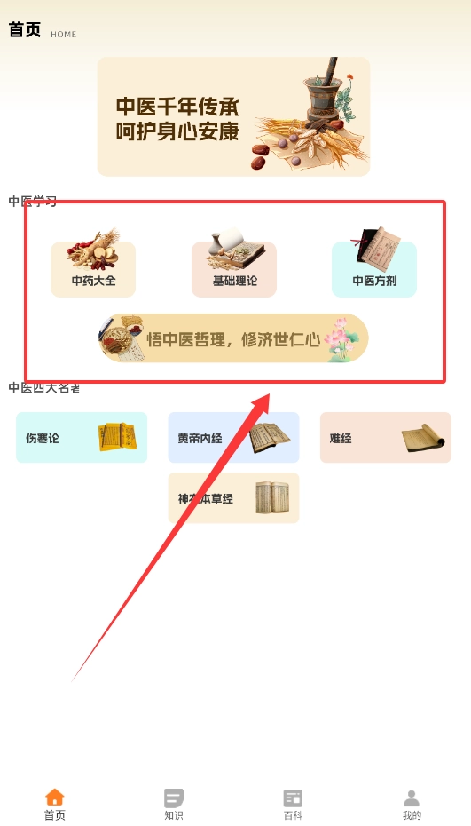 1、能看到中医宣传图和学习板块,往下划还有四大名著区域,底部导航栏可以切换页面。