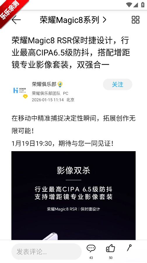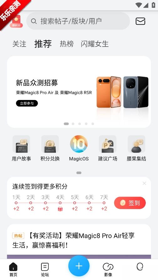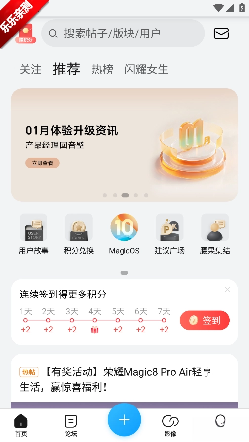 荣耀俱乐部是荣耀终端有限公司打造的综合性互动交流平台,面向荣耀用户与科技爱好者。该平台围绕“科技资讯、生活分享、玩机技巧、社区互动”四大核心,提供从产品评测到售后服务的全链路支持,旨在构建以用户为中心的智能生活社区。平台具备实时推送功能,涵盖荣耀手机、智慧生活IoT产品、配件等新品发布信息,同时覆盖系统更新、行业动态等深度内容;提供权威产品评测,助力用户了解产品性能、设计及性价比,为购买决策提供参考;支持用户就手机使用、技术难题等话题发起讨论,工程师与资深用户会实时解答;设有美图、美食、美景等生活板块,用户可上传4K超清图片或长文并添加地理位置标签,平台每日更新摄影师原创作品,还支持按设备型号筛选适配壁纸,用户可进行收藏与评分操作。