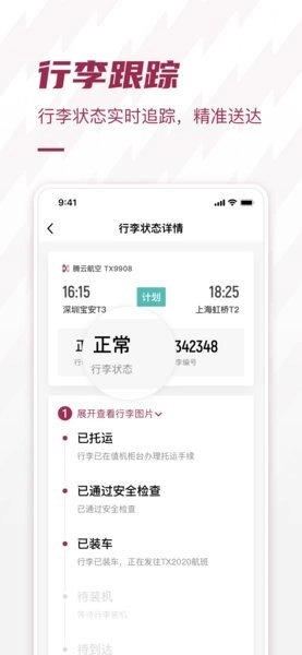 5、行李托运实现全流程可视化,从值机柜台到进入货舱的各个环节均会实时更新状态;