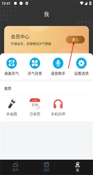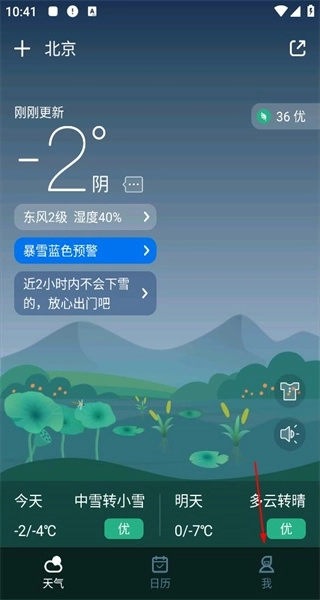 打开软件后,先进入首页查看北京的天气信息,接着点击“我的”选项进入个人中心页面。