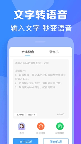 培音的特色之一是影视类配音,无论是广告片、影视片、专题片还是动画后期配音,都能提供高质量服务。此外,培音还支持随时随地的录音功能,操作也十分简单,可随意切换中英文并选择多种发音人。无论你需要广告配音、专题片配音,还是商场店铺促销、地摊叫卖录音、有声朗读、超市促销、清仓大处理等各类场景的配音制作,培音都是你的最佳选择。