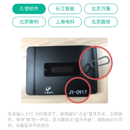 6、安装完成后,依据所获取的ETC设备,查看其正面以确认品牌,随后开启对应的蓝牙开关。
