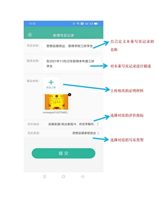 在写实记录界面完成本条记录的相关描述填写与材料上传操作后,点击提交按钮。
