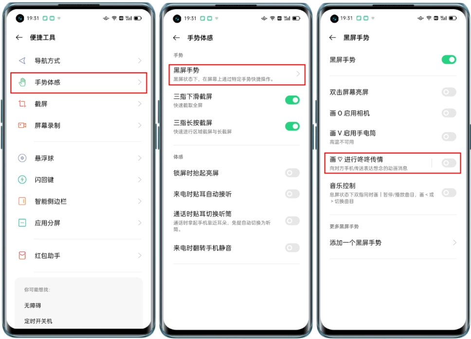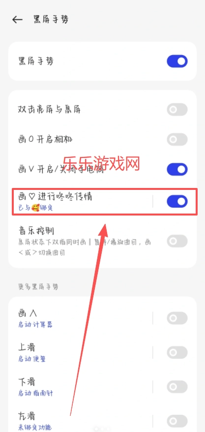 进入手机「设置 > 便携工具 > 手势体感 > 黑屏手势」,然后开启“画❤进行咚咚传情”功能。