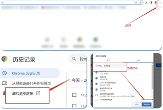 方式①启动谷歌浏览器,点击右上角的三个小圆点,接着选择历史记录选项,最后执行清除浏览数据的操作。
