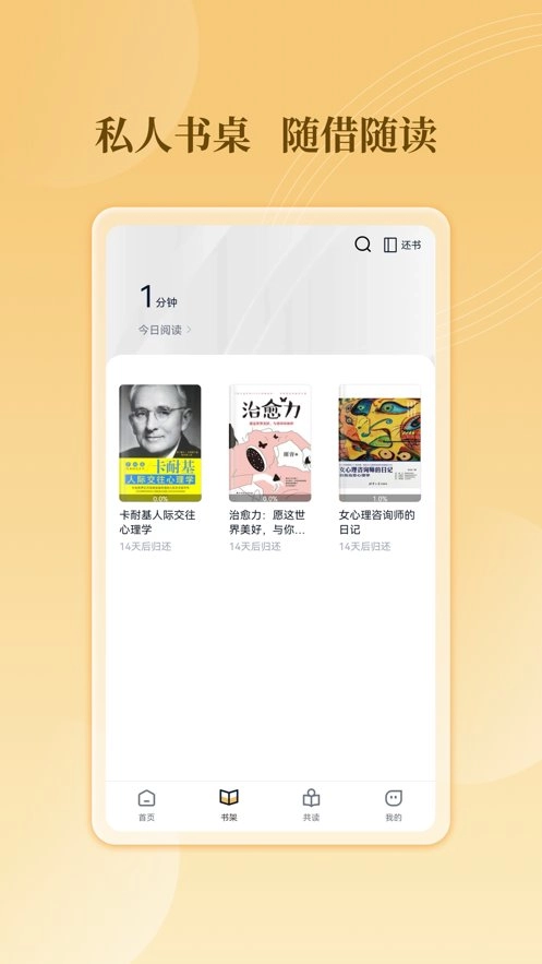 3、图书自动归还。无需再为线下还书而烦恼,随时都能一键完成还书操作!系统还具备按借阅期限自动归还图书的功能。