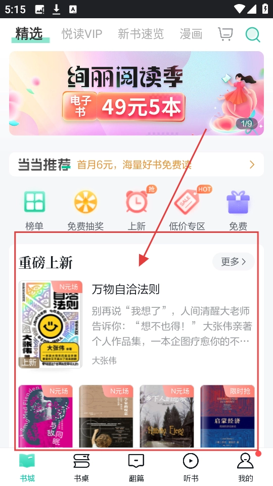 若想试读新书,可在书城的“重磅上新”区域挑选一本,例如《万物自洽法则》,然后点击进入该书的详情页面。