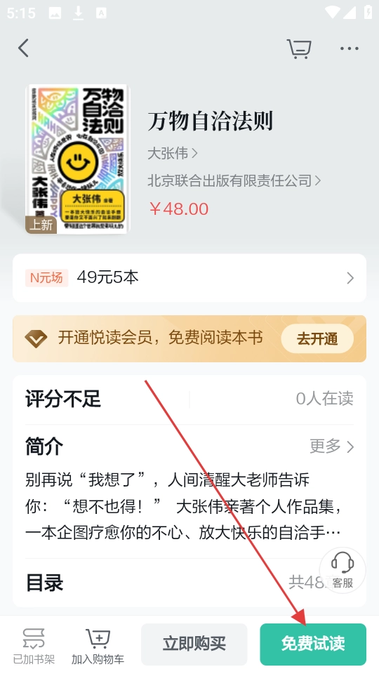 2、进入书籍详情页面后,找到【免费试读】按钮并点击,即可开启该书的免费试读。