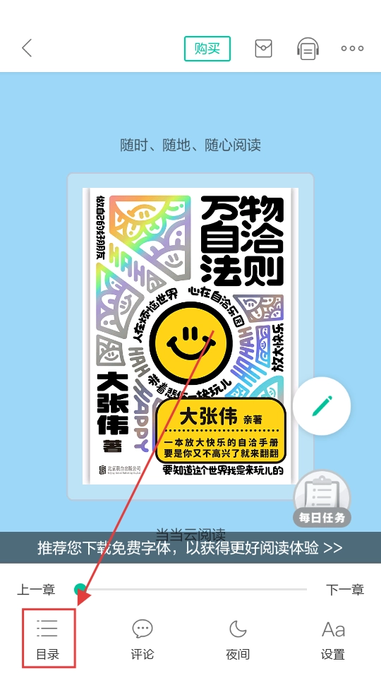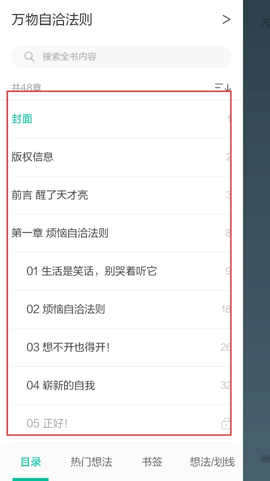 3、进入试读页面后,找到【目录】按钮并点击,即可查看该书的章节目录。
